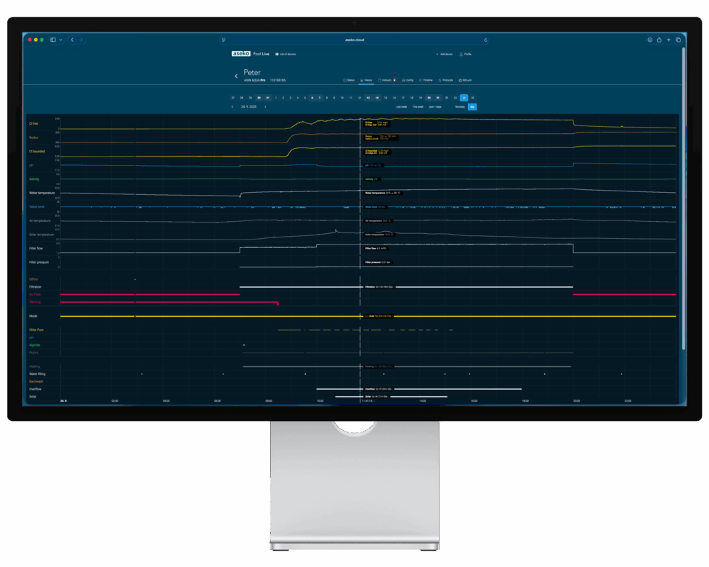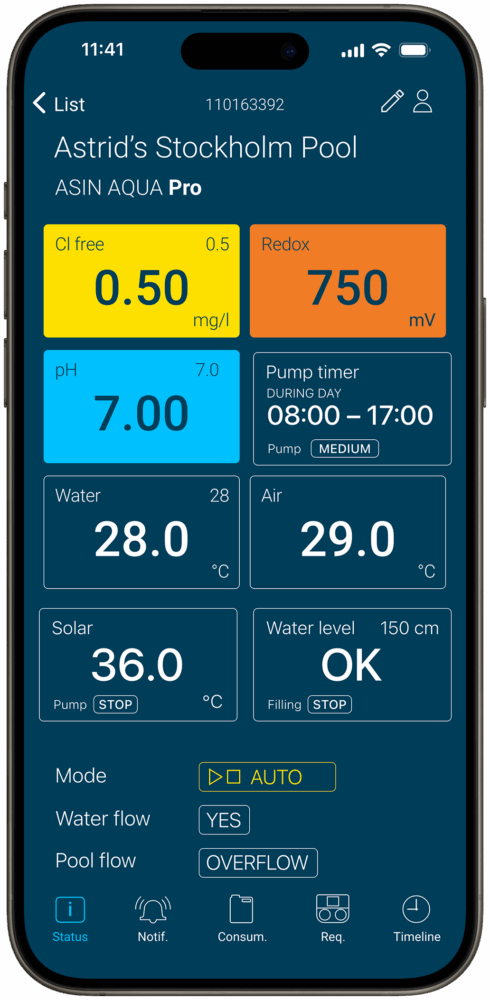 Unmatched professional equipment for precise pool chemistry control and automated pool technology management. The device can be monitored and controlled remotely via ASEKO apps.